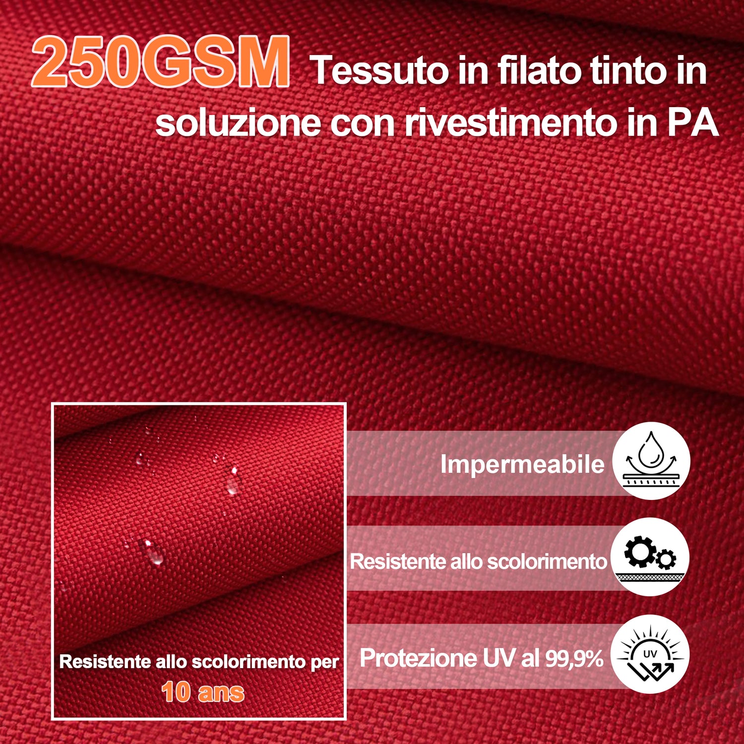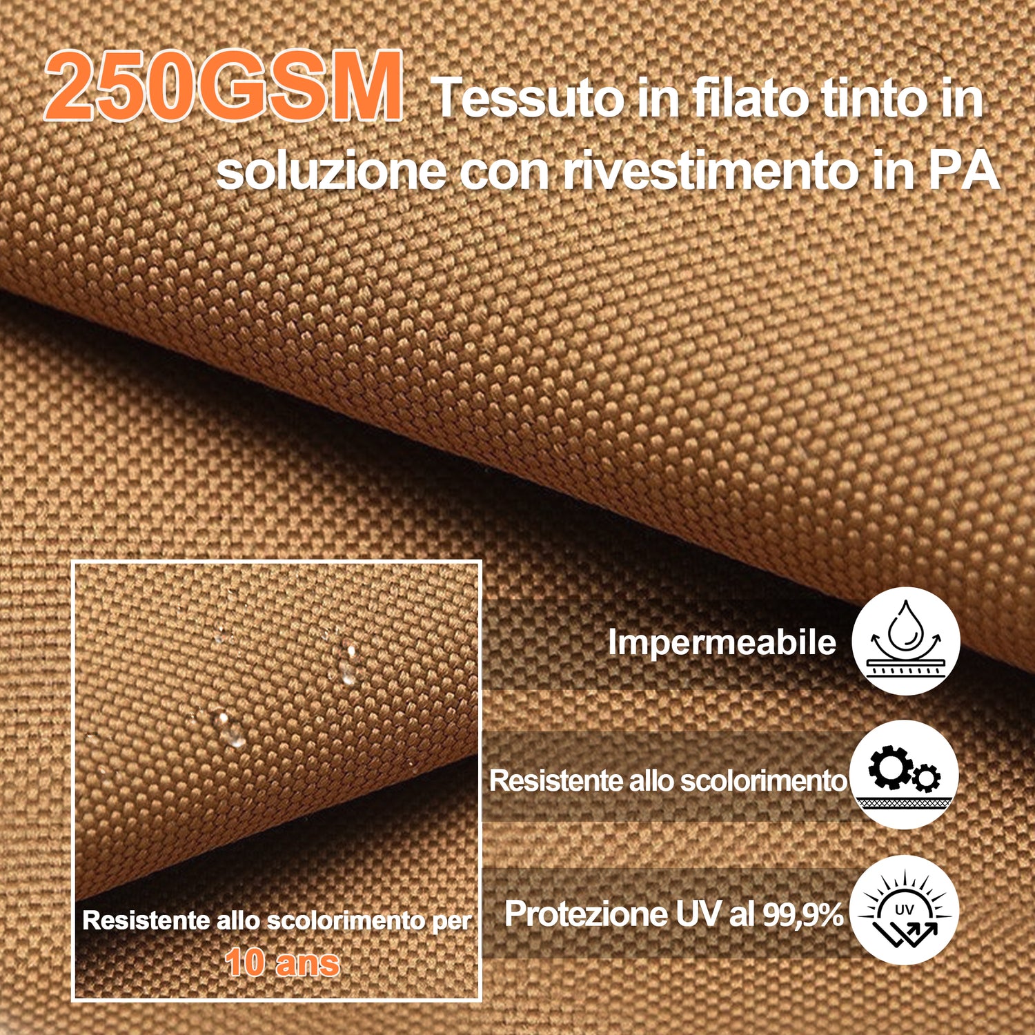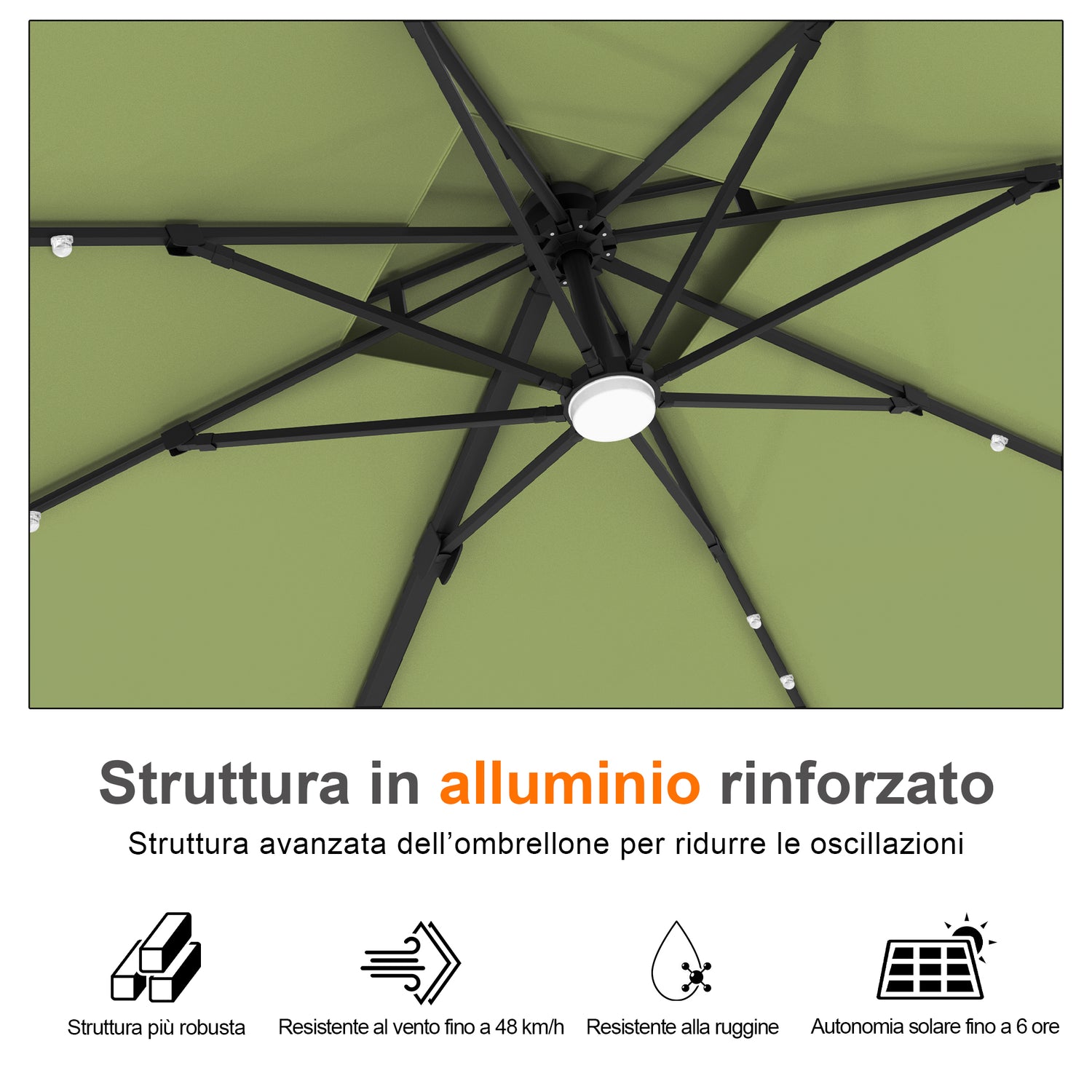 Realizzato con tessuto acrilico di alta qualità, questo ombrellone è progettato per resistere al sole. È resistente allo scolorimento per un massimo di 10 anni, anche sotto forte esposizione ai raggi UV, così il tuo spazio esterno rimarrà sempre vivace, elegante e brillante anno dopo anno.