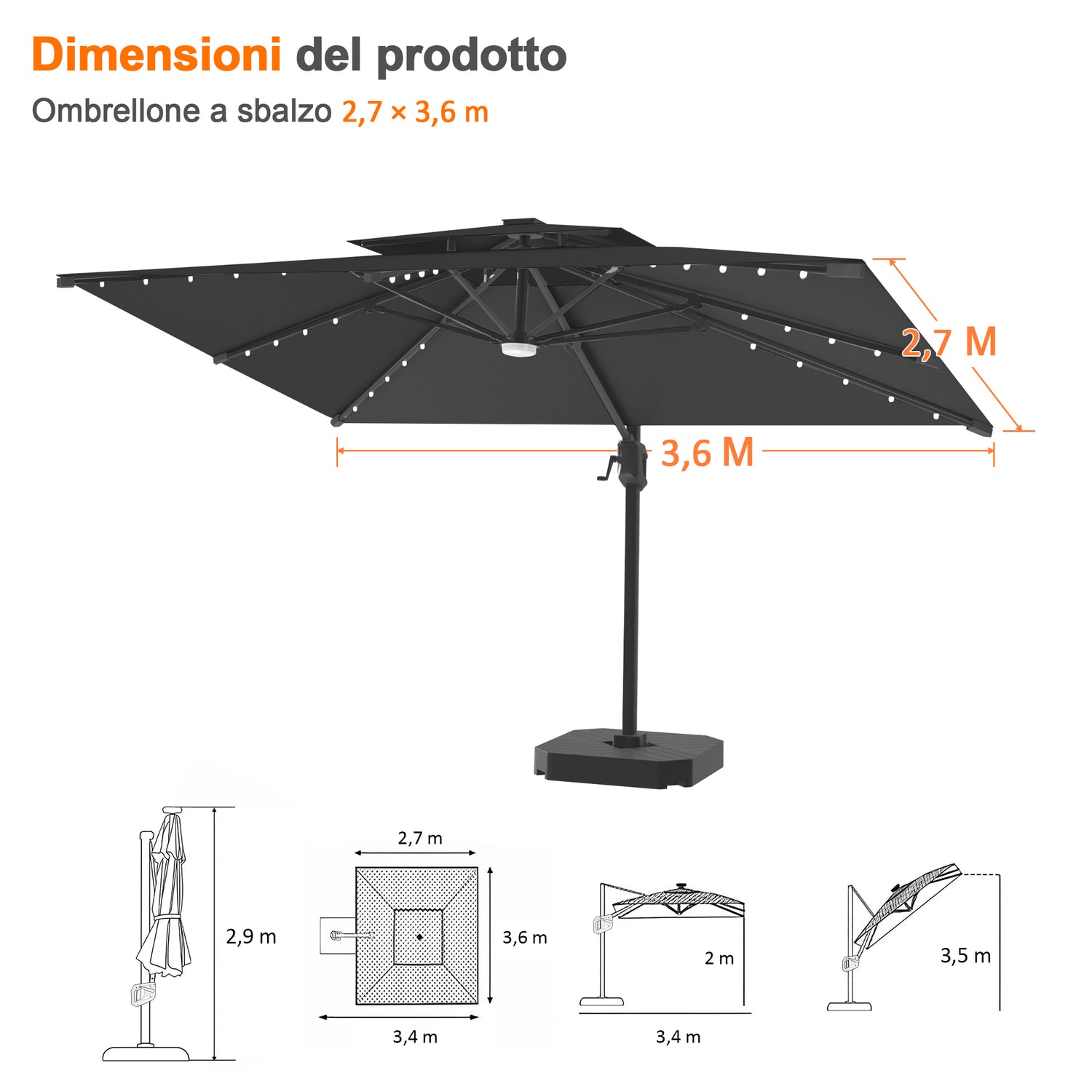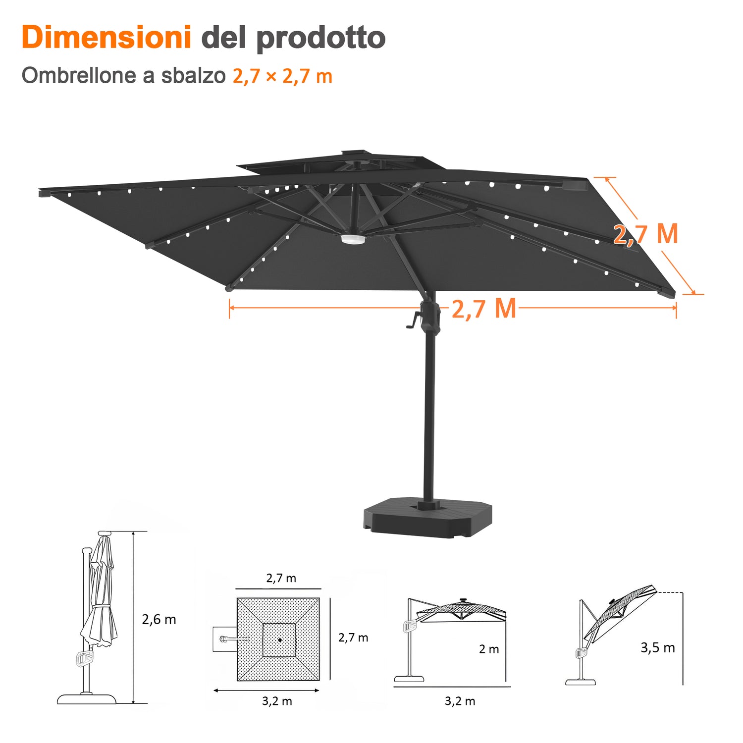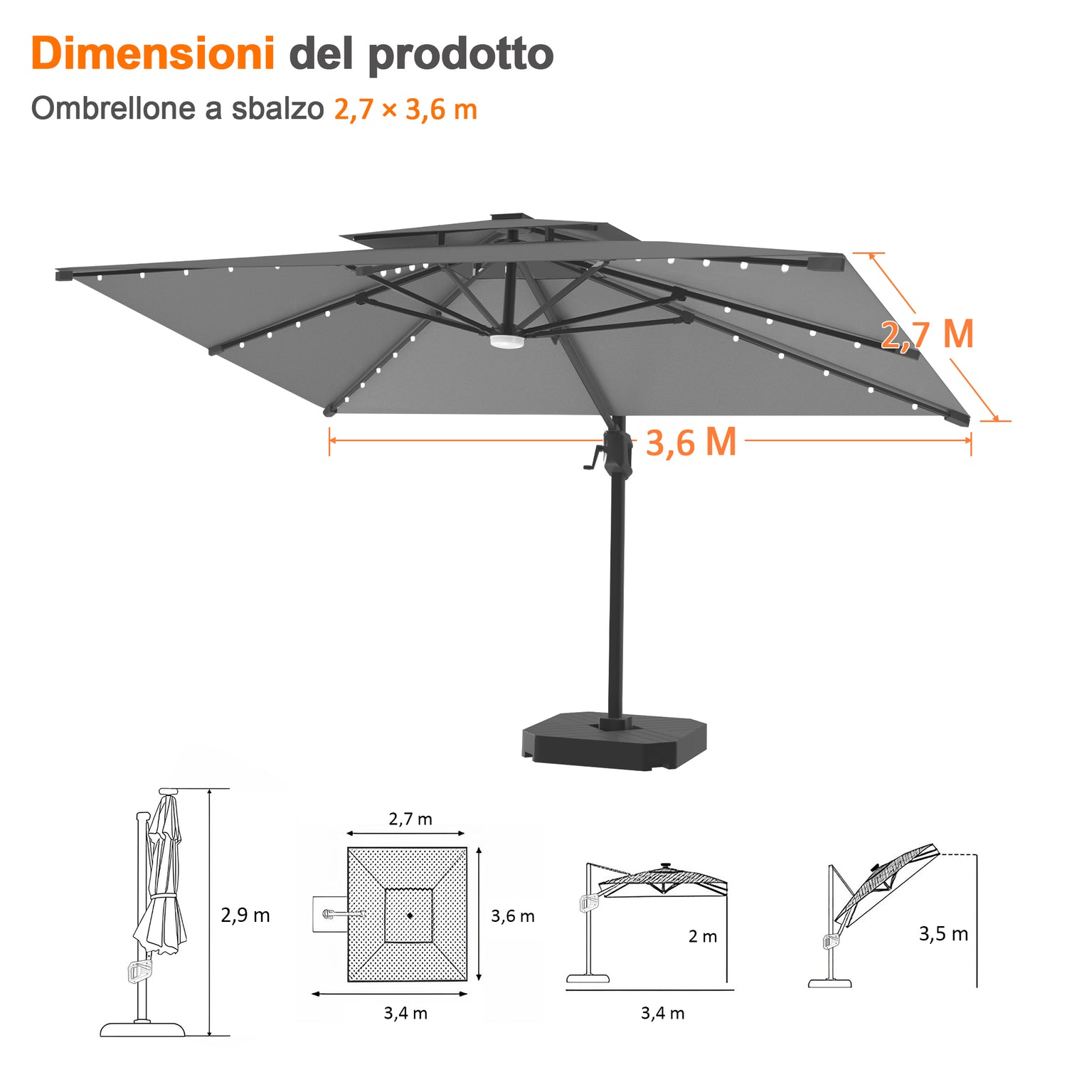 Realizzato con tessuto acrilico di alta qualità, questo ombrellone è progettato per resistere al sole. È resistente allo scolorimento per un massimo di 10 anni, anche sotto forte esposizione ai raggi UV, così il tuo spazio esterno rimarrà sempre vivace, elegante e brillante anno dopo anno.