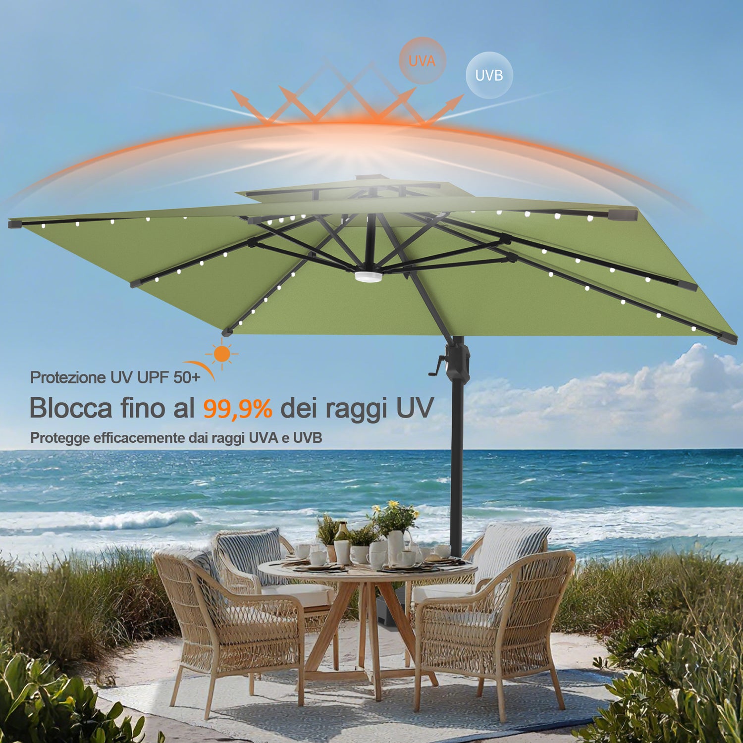 Concediti brunch più lunghi, pisolini senza fretta e momenti di relax all’aperto.Il nostro telo in acrilico di alta qualità blocca fino al 99,9% dei raggi UV nocivi, permettendoti di rilassarti, pranzare o riposare all’esterno senza preoccupazioni.È come indossare la crema solare — senza doverla mettere davvero.