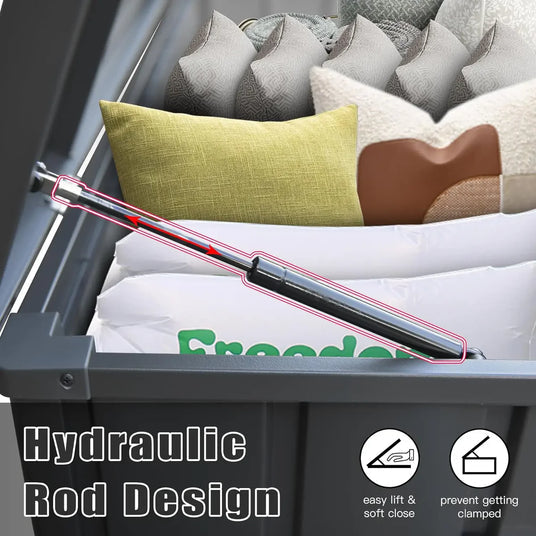 Il box contenitore Patioslife è dotato di pistoni idraulici fluidi e affidabili che rendono l’apertura e la chiusura semplici e senza fatica. Niente sollevamenti pesanti, niente sforzi inutili: il coperchio si apre con un tocco leggero e si richiude lentamente e in modo sicuro. Una soluzione ideale per famiglie, persone anziane e per chi cerca comfort, praticità e facilità d’uso nello stoccaggio da esterno.