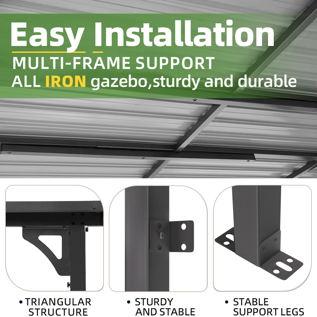 Il gazebo è dotato di ganci integrati a soffitto per luci o decorazioni e di un sistema di drenaggio integrato che convoglia efficacemente l’acqua piovana, aiutando a prevenire ristagni e corrosione nel tempo.