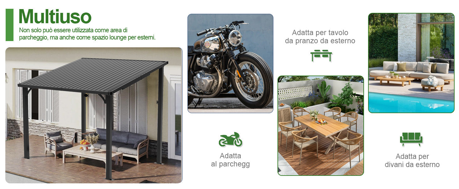 Utilizza acqua e sapone neutro per pulire la struttura e la copertura.Evita prodotti chimici aggressivi o idropulitrici ad alta pressione.Controlla periodicamente bulloni e viti per assicurarti che tutto sia ben fissato, soprattutto dopo temporali o forti raffiche di vento.