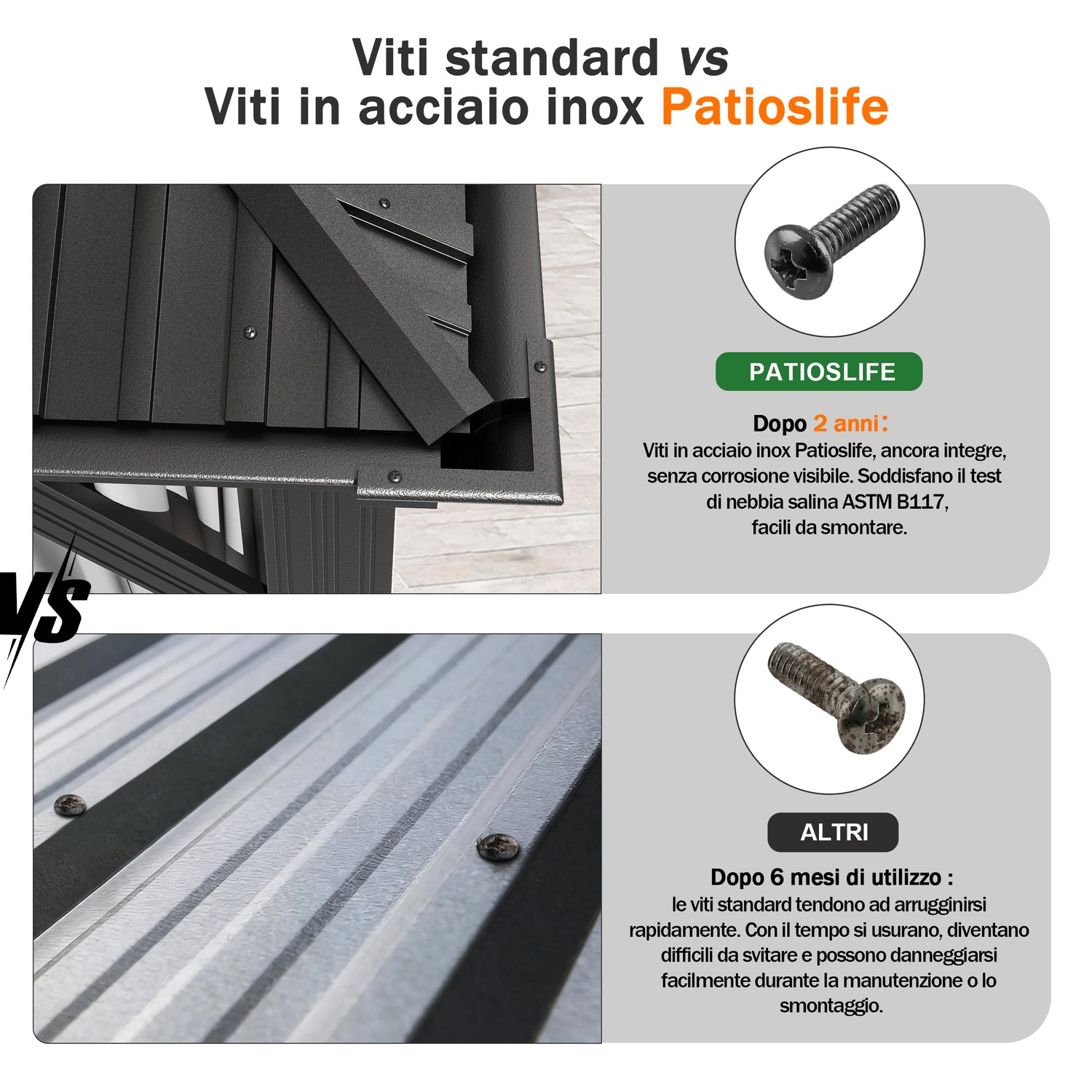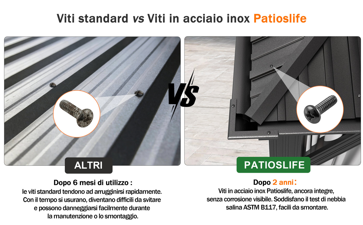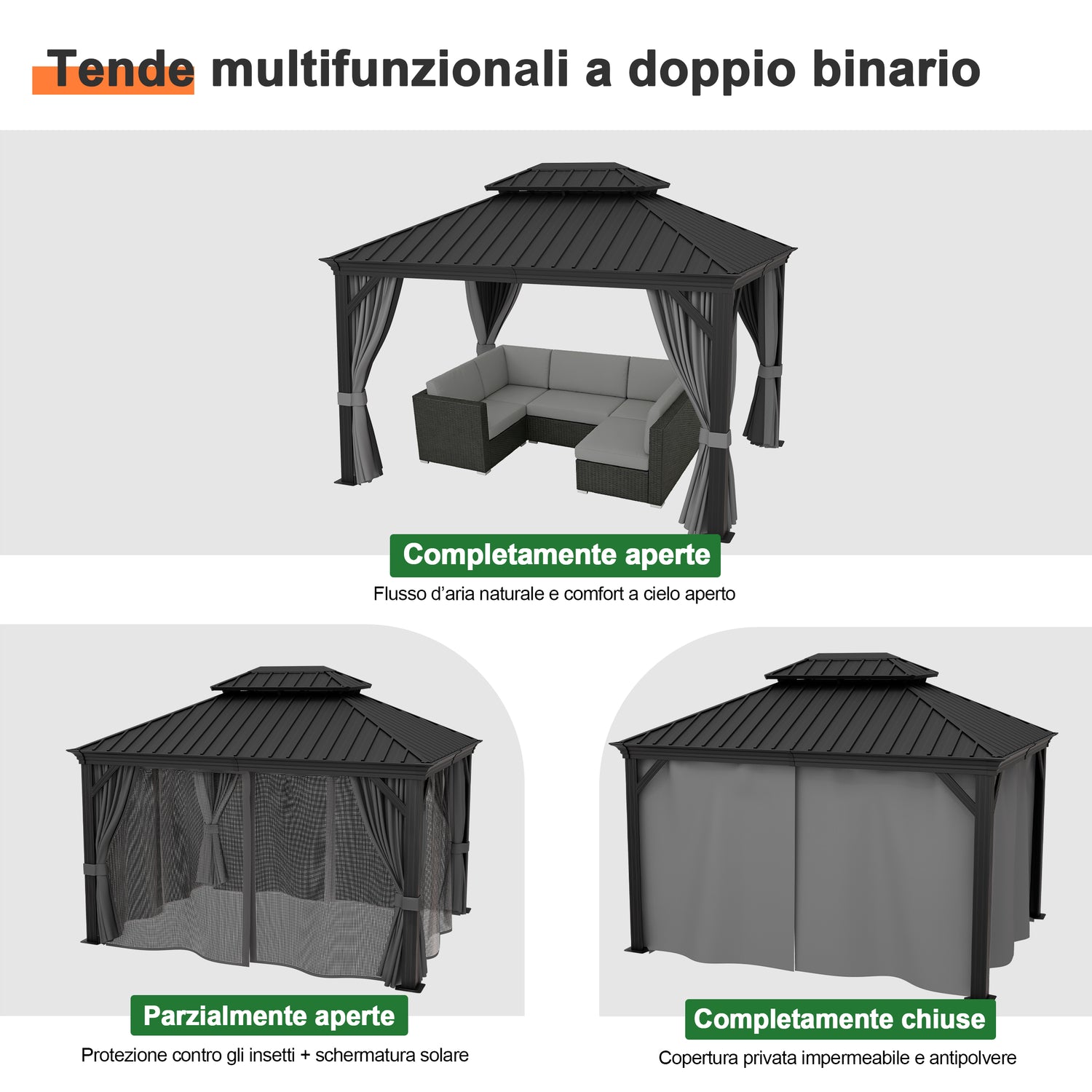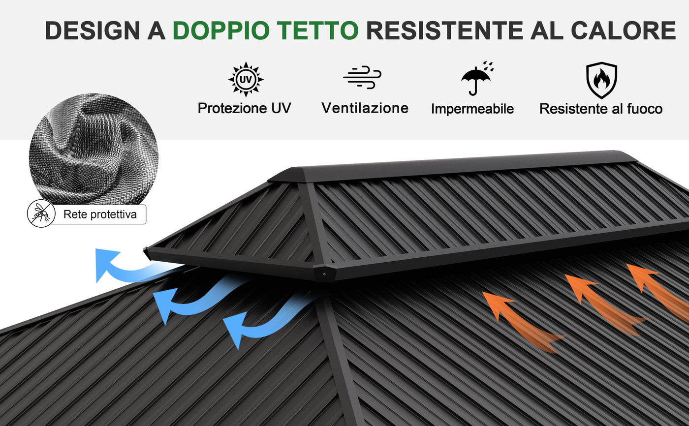 Il design a doppio tetto ventilato migliora la circolazione dell’aria e garantisce una protezione duratura contro sole intenso, pioggia e vento, mantenendo colore e solidità nel tempo.