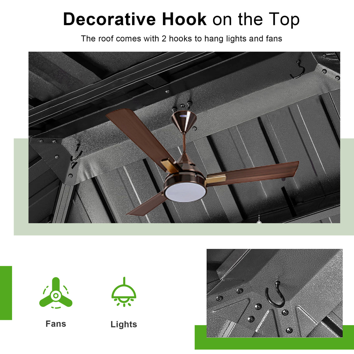 I ganci a forma di “J” posizionati nella parte superiore sono ideali per appendere luci, ventilatori o altri elementi decorativi, permettendoti di personalizzare facilmente lo spazio secondo le tue esigenze.
