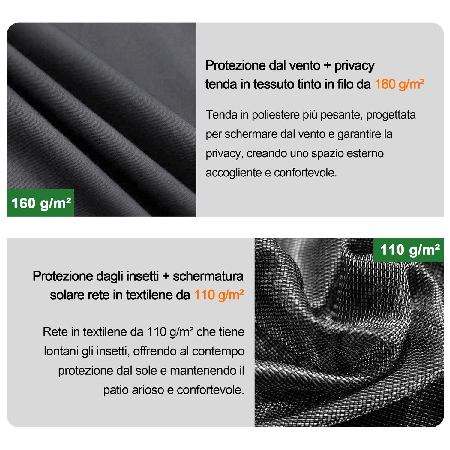 Il sistema a doppio binario scorrevole, con tende oscuranti dotate di cerniera e zanzariere su tutti e quattro i lati, consente un’apertura e chiusura semplice e fluida.I tessuti sono progettati per durare nel tempo, risultando resistenti all’acqua e allo scolorimento, ideali per l’uso outdoor quotidiano.
