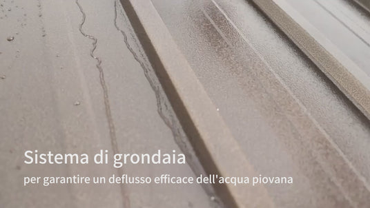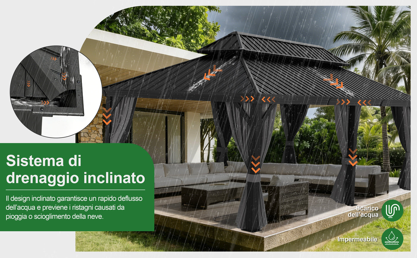 Il design inclinato avanzato consente un rapido deflusso dell’acqua, evitando ristagni e garantendo uno scarico fluido anche durante lo scioglimento della neve.Questo sistema impermeabile contribuisce a mantenere il gazebo asciutto e durevole tutto l’anno.