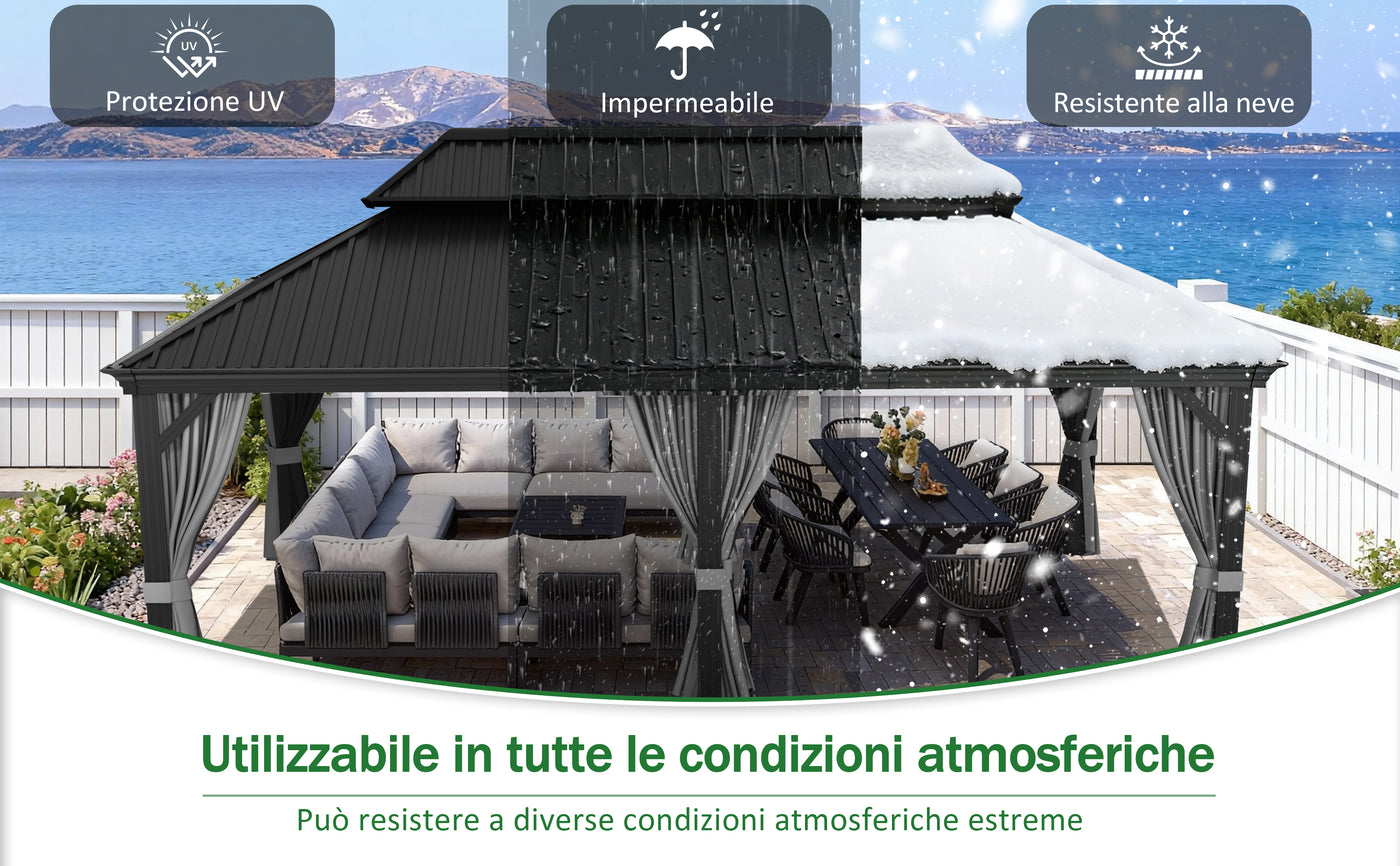 Sì, il gazebo è progettato per un utilizzo durante tutte e quattro le stagioni.La copertura offre una protezione UV del 99% con fattore UPF 50+, mentre la capacità di carico della neve è pari a circa 107 kg/m².Nelle zone soggette a nevicate abbondanti, si consiglia di rimuovere tempestivamente la neve accumulata per preservare la struttura.