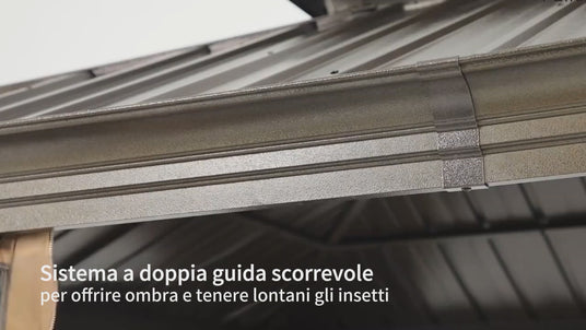 Il pacco include il telaio in alluminio verniciato a polvere, i pannelli del tetto in acciaio zincato, il sistema a doppia traccia, le tende e la rete, il gancio per il soffitto, le viti e gli ancoraggi. L'assemblaggio richiede alcune ore con 2-5 persone. È necessaria una superficie piana e resistente; per i migliori risultati, consigliamo l'installazione da parte di professionisti.