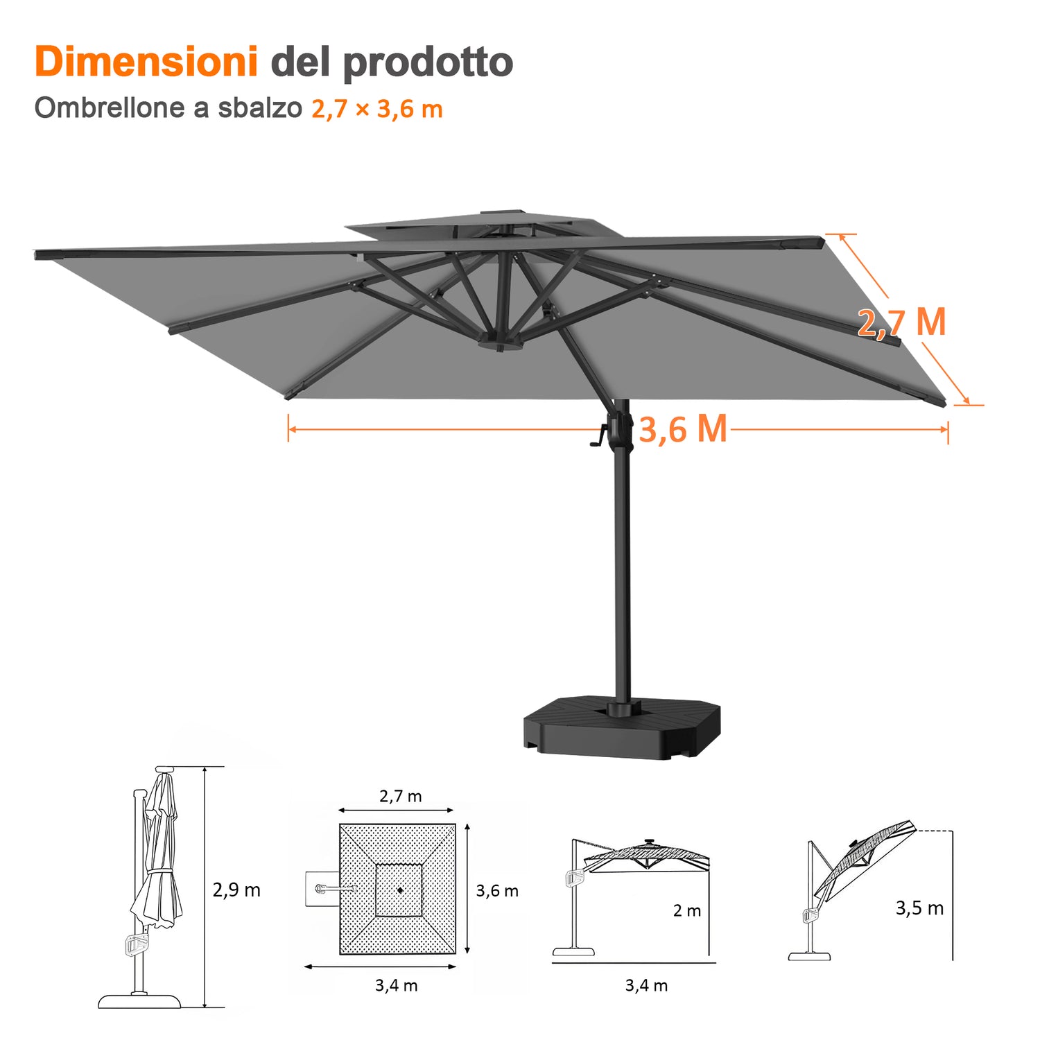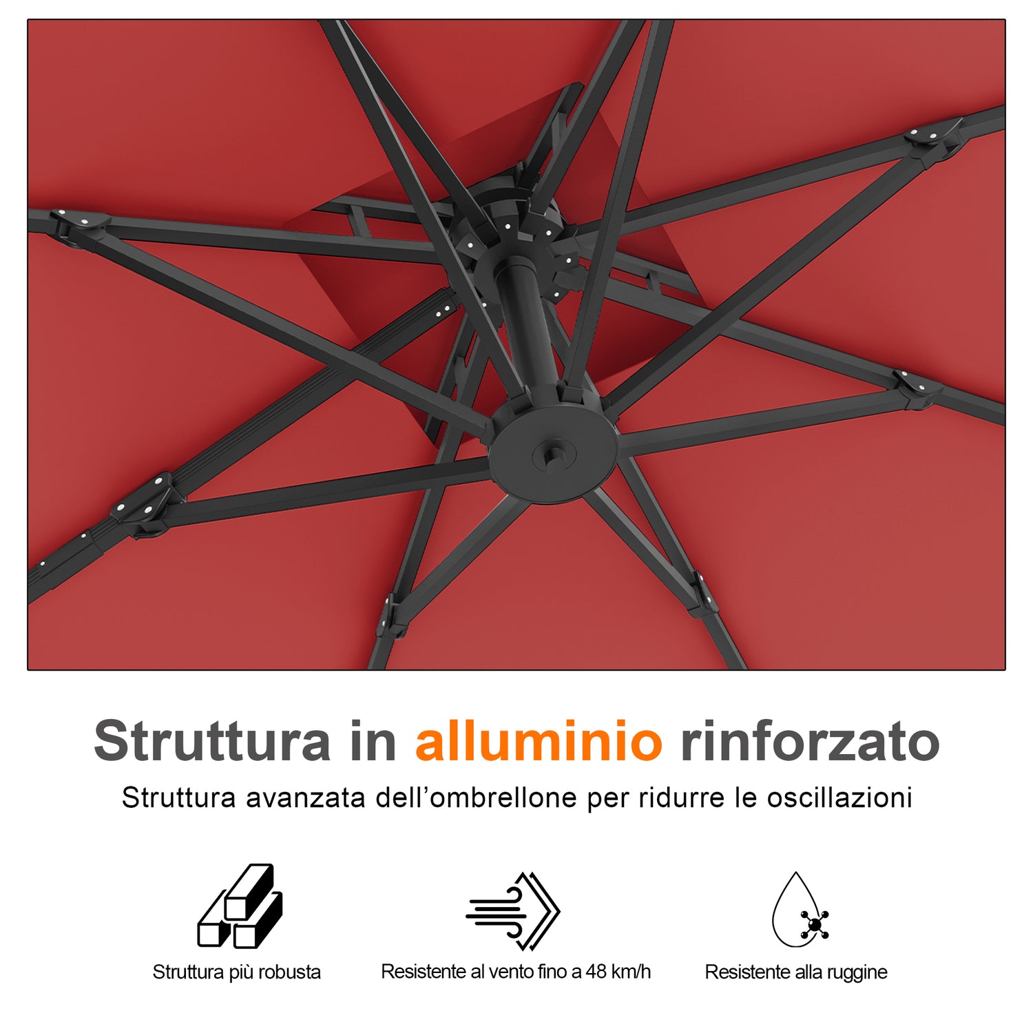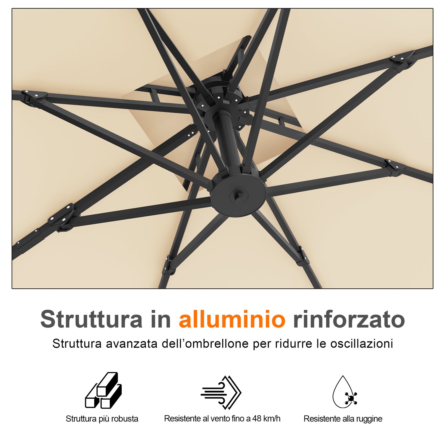 Nota: ogni ombrellone viene fornito con una base a croce in metallo. Per una stabilità e una sicurezza ottimali, non consigliamo l’utilizzo della base a croce da sola. È preferibile acquistare separatamente una base zavorrata compatibile oppure scegliere il bundle Ombrellone + Base con ruote, che include una base zavorrata appositamente progettata per sostenere l’ombrellone in modo sicuro e consentire uno spostamento agevole.
