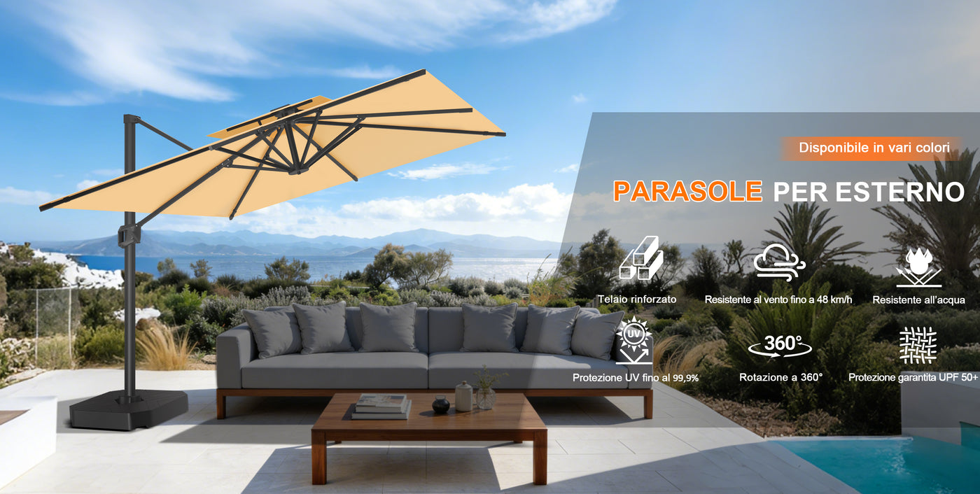 Crea uno spazio outdoor elegante e piacevolmente ombreggiato con il nostro ombrellone a braccio premium, ideale per patio, giardini e aree piscina.