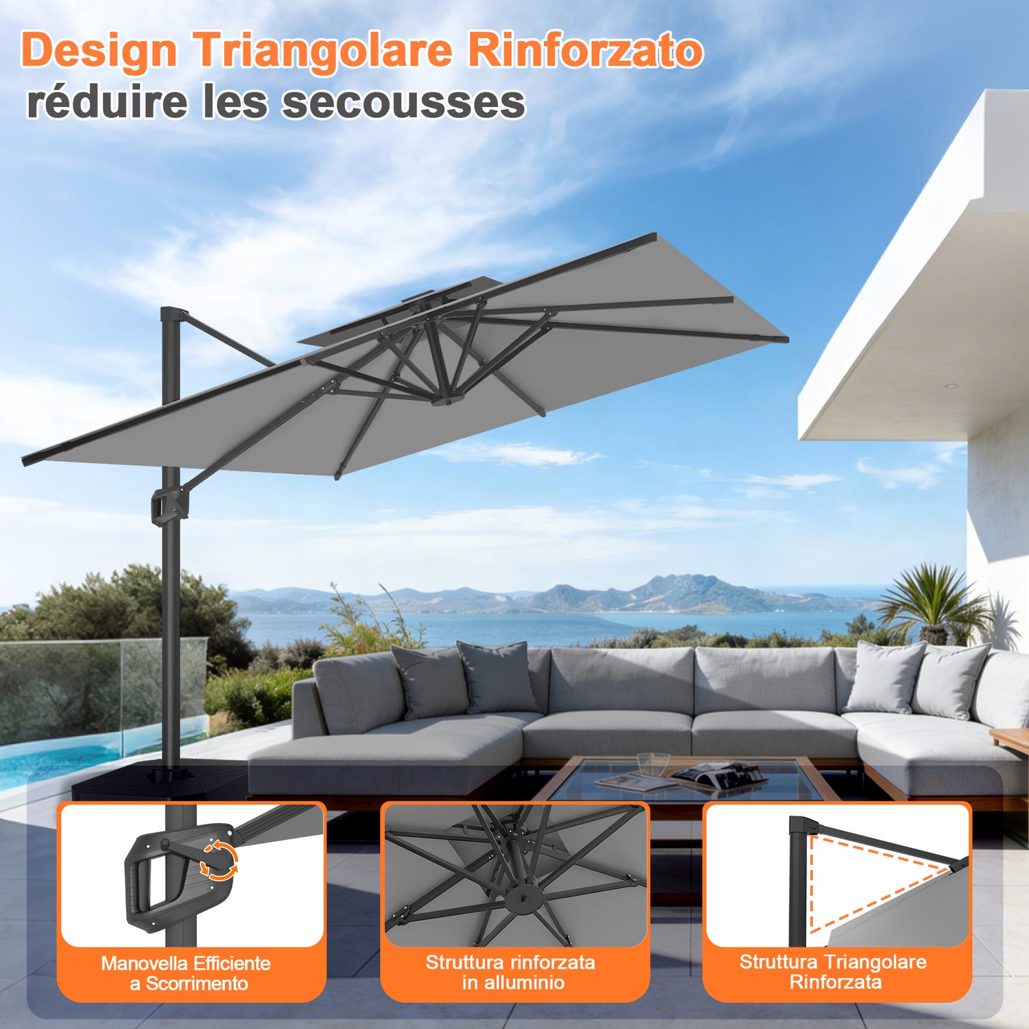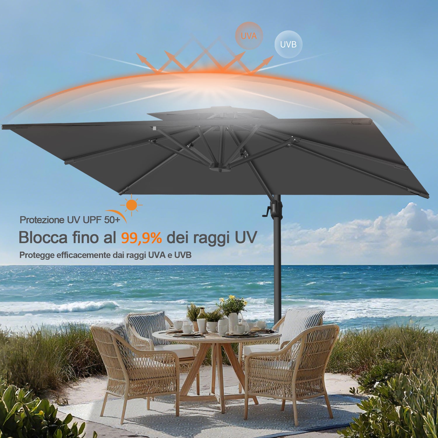Goditi al meglio la vita all’aperto grazie alla rotazione fluida a 360° e alla regolazione semplice dell’inclinazione, per un’ombra sempre comoda e personalizzata da ogni angolazione.Che tu stia rilassandoti a bordo piscina, organizzando un brunch in giardino o godendoti un momento di relax sul deck o sul patio, comfort e protezione sono sempre a portata di mano.